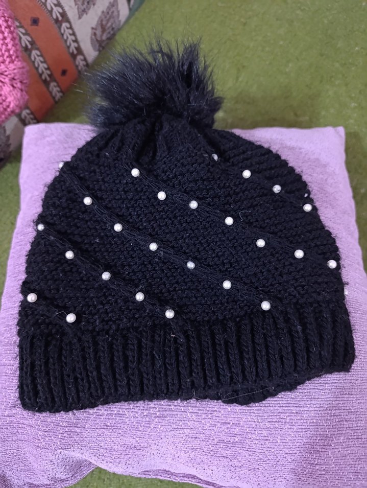 Siyah renkli örme kadın bere, inci detayları ve üstte yumuşak ponpon ile rahat ve gotik bir tarz sunar. ❄️çok az giyildii. İçi örgü astarlı