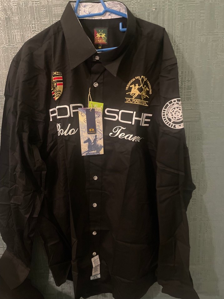 Düğmeli, baskılı Porsche logolu siyah erkek uzun kollu gömlek. Normal kesim ve yakası kesik yaka, günlük ve ofis kullanımı için uygun. La Martına marka 4/Xl bed