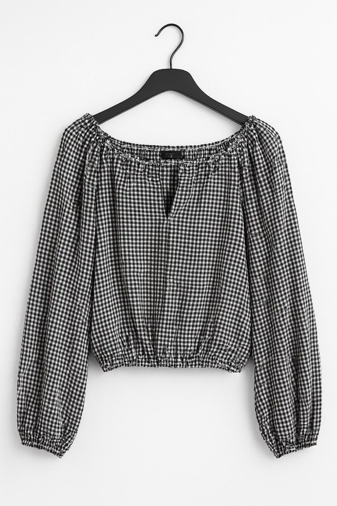 Siyah kare desenli kadın bluz, uzun kollu ve kayık yaka tasarıma sahiptir. Pamuklu kumaştan yapılmış, crop ve bol kesimdir.