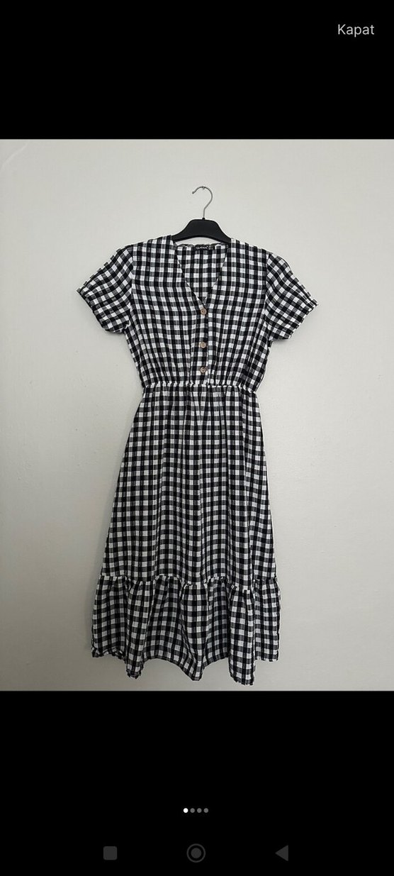 Siyah ekose desenli, kısa kollu ve V yakalı bu pamuklu elbise düğmeli ve belden büzgülü, rahat ve salaş kesime sahip. Günlük kullanıma uygundur.