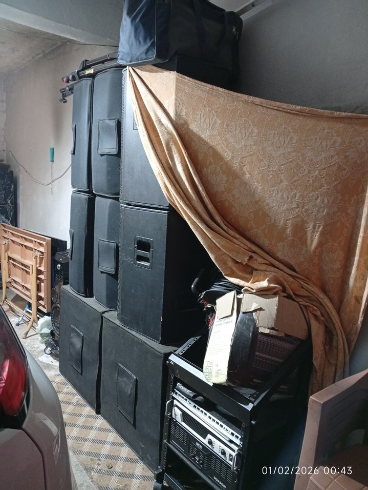 Güçlü ses çıkışı için üst üste konulmuş çok sayıda siyah profesyonel müzik sistemi hoparlörü.