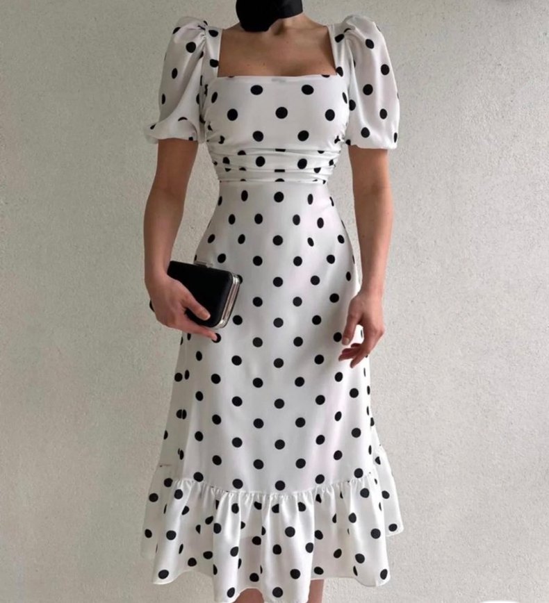 Uzun beyaz elbise, siyah puantiyeler, tekne yaka ve askılı kollarla klasik ve zarif görünüm sunar. Alt kısmında fırfır detay vardır.