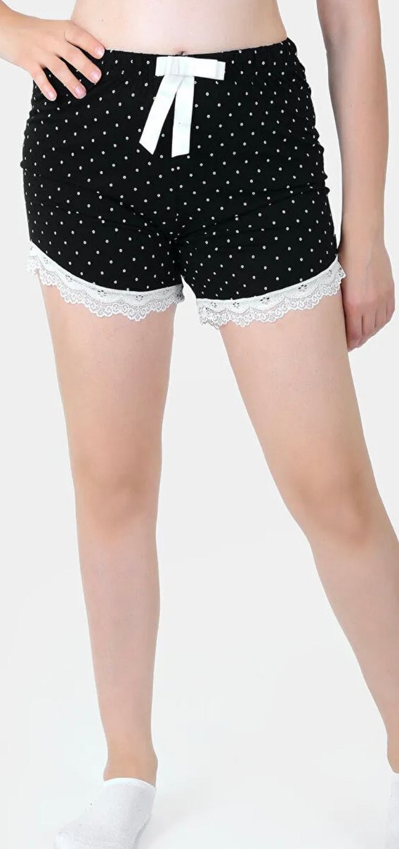 Siyah Puantiyeli Dantel Detaylı Şort Ev ve Pijama Altı