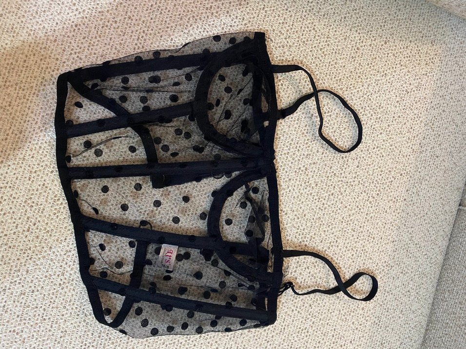 Siyah, puantiyeli dantel desene sahip, ince askılı ve straplez yakalı, sentetik kumaştan mini ve vücuda oturan bir büstiyerdir. Goth tarzına uygundur.