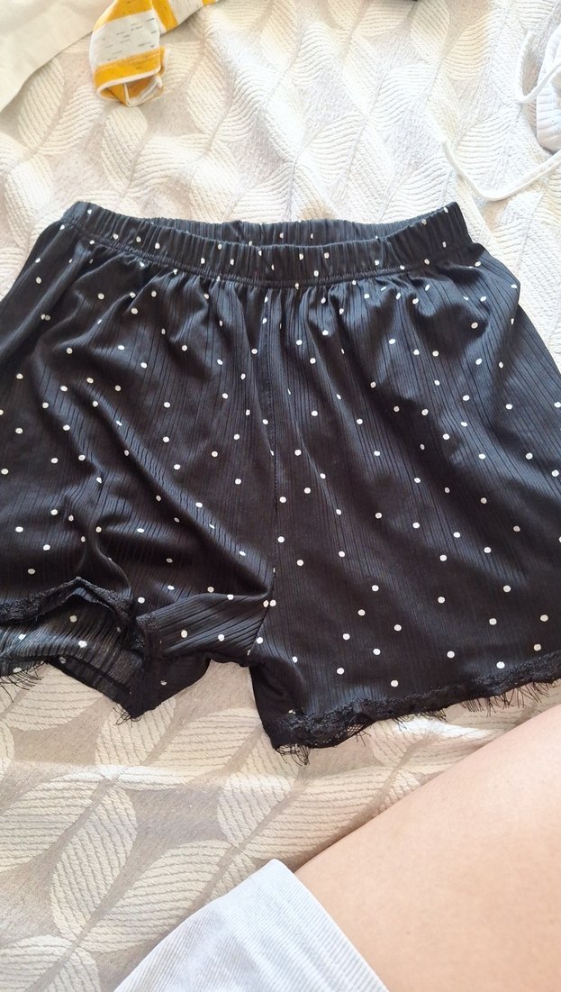 Siyah mini şort, parlak saten kumaş, beyaz puantiyeler ve dantel detaylarla bol kesim sunar.
