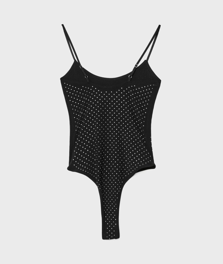 Siyah, puantiyeli ve dantelli detaylara sahip, ince askılı ve vücuda oturan goth athleisure tarzı monokini. Midi boy, günlük kullanım için uygun.