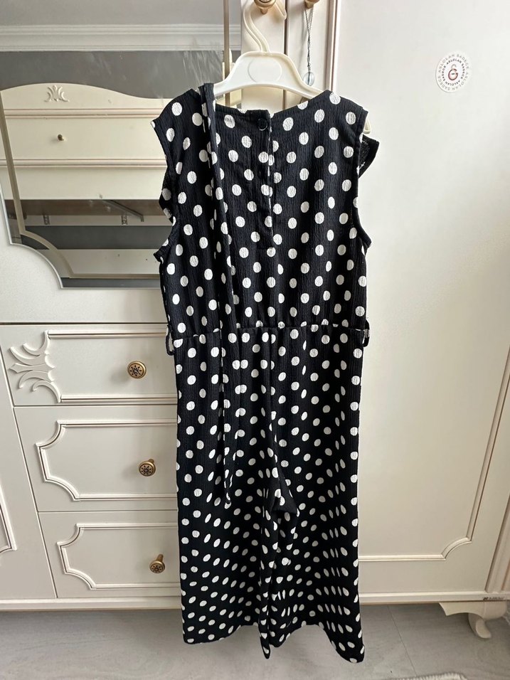 Siyah üzerine beyaz puantiyeli, düğmeli ve kolsuz uzun çocuk tulumu. Temiz sıkıntısız yazın kışın rahat kullanılabilir