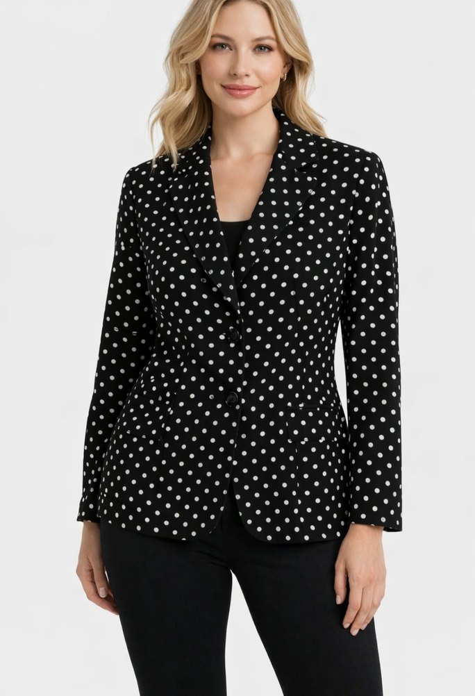 Siyah puantiyeli, düğmeli, normal boy, uzun kollu kadın blazer. Notch yaka ve regular fit ile ofis için uygun, çağdaş tarzda.