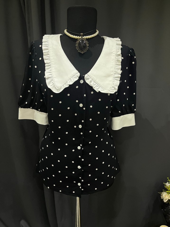 Pamuk kumaştan, siyah zemin üzerine beyaz puantiyeli, düğmeli önden, beyaz fırfırlı yakalı, kısa kollu, bol kesim kadın bluz. Vintage gömlek muazzam güzellikte. M beden