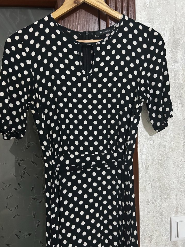 Siyah renkli, beyaz puantiyeli ve etek ucu fırfırlı, rahat kesim uzun elbise. Göğüs kısmında ufak bir yırtmacı var sentetik kumaştan, bohem tarzda günlük kullanıma uygun. Milladan aldım
