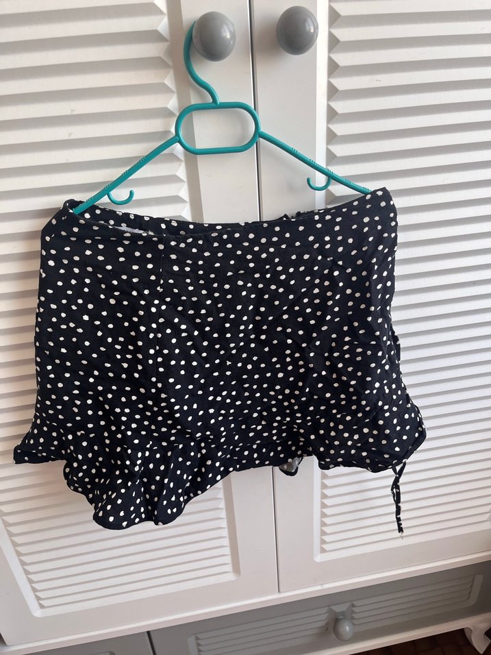 Siyah puantiyeli, bol kesim mini etek, yumuşak sentetik kumaştan, fırfır detaylı, dış mekan kullanımı için uygun.