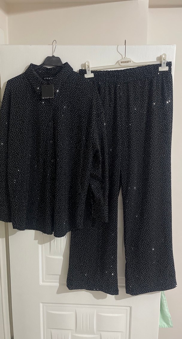 Siyah puantiyeli kadın takımı, bol kesim ve mini boydadır. Uzun kollu, yakalı ve düğmeli tasarımıyla romantik akşamlar için uygundur. Rahat ve şık bir görünüm sunar.daha yenidir etiketi üstündedir