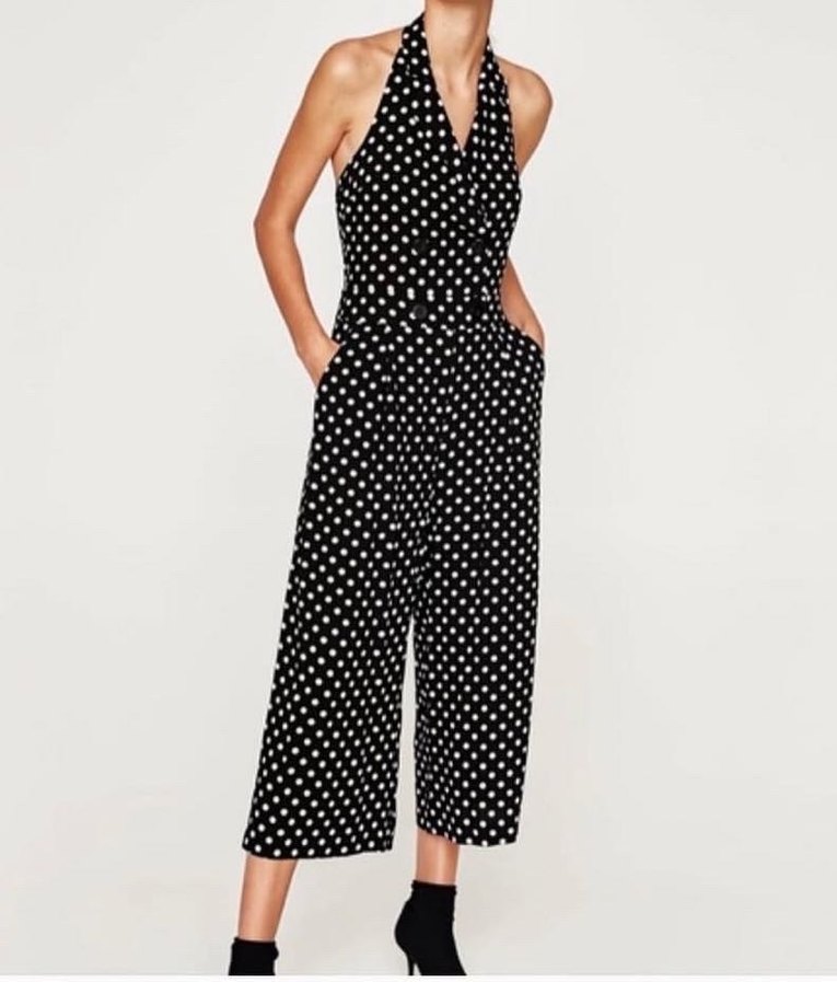 Siyah pamuklu tulum, kolsuz ve V yakalıdır. Kemerli ve bol kesimdir, puantiyeli deseniyle günlük sokak modasına uygundur. 1 2 kere giyildi tertemiz fermuar kısmında küçük sökük var fotoğraflarada ekledim dikilebilir bana beden olarak olmadığı için satıyorum