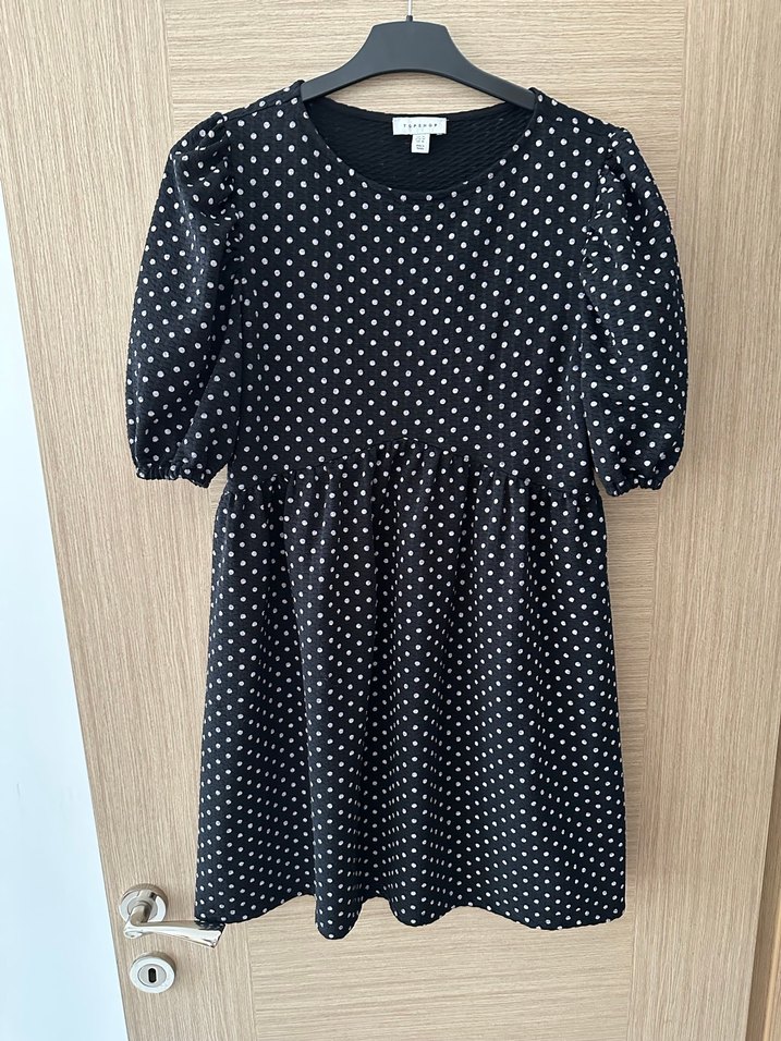 Siyah renkte, kısa kollu ve yuvarlak yakalı, puantiyeli, bol kesim mini elbisedir.