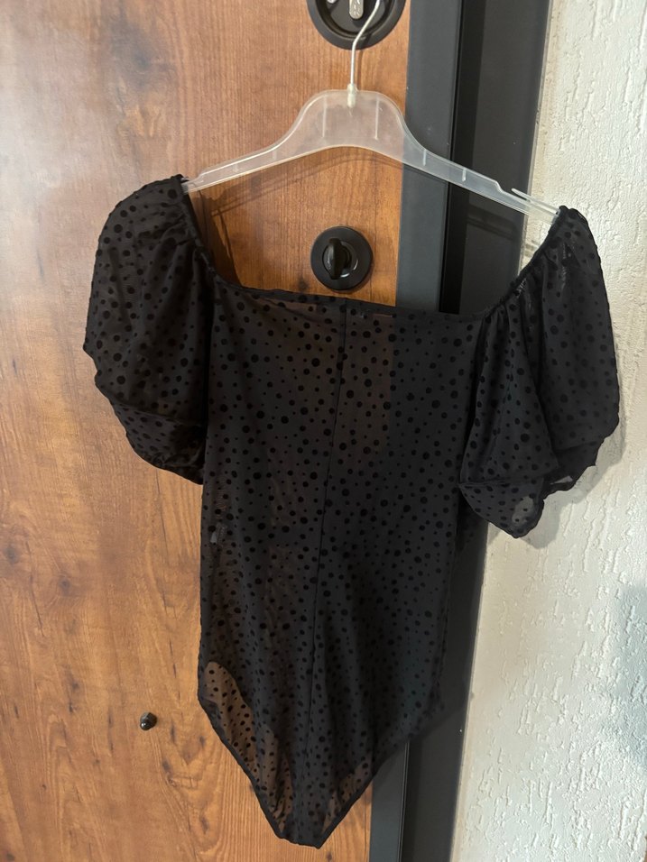 Kısa kollu, V yaka, mini uzunlukta ve düğmeli detaylara sahip siyah puantiyeli dar kesim bluz. Yumuşak sentetik kumaştan, günlük kullanım için uygun. Çıtçıtlı transparan