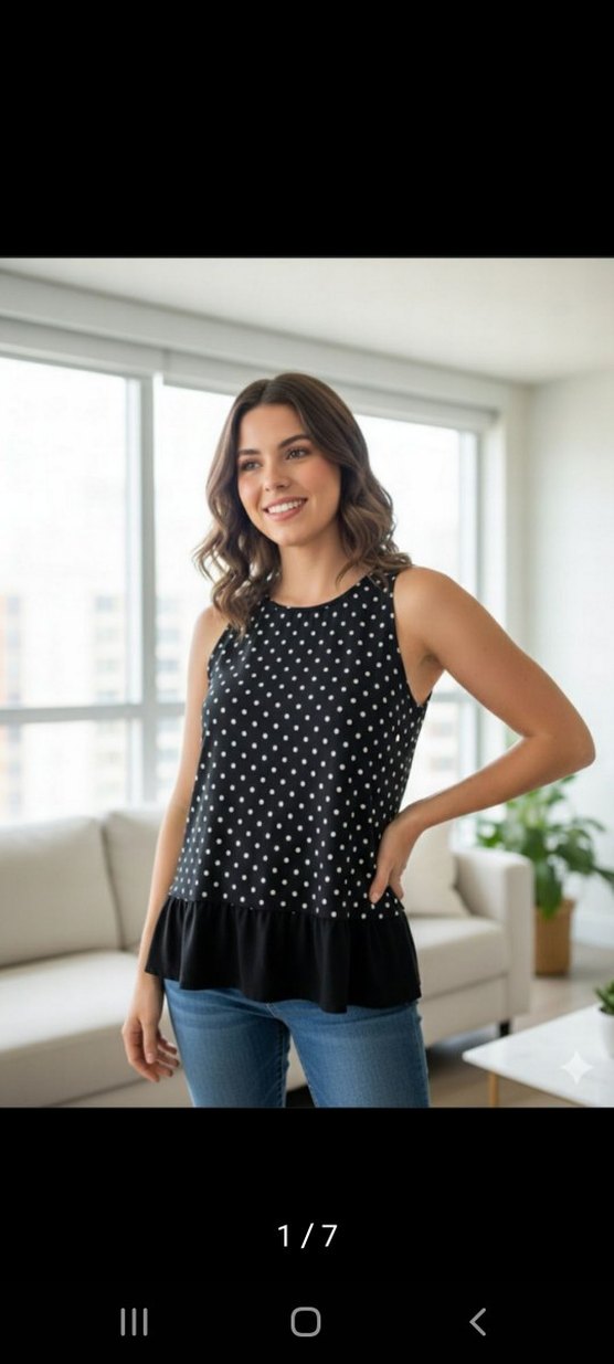 Siyah kolsuz bluz, V yaka ve bol kesimlidir. Yumuşak pamuktan yapılmış, puantiyeli desene ve etekte fırfır detaya sahiptir. Günlük kullanım için uygundur. Boy 60cm