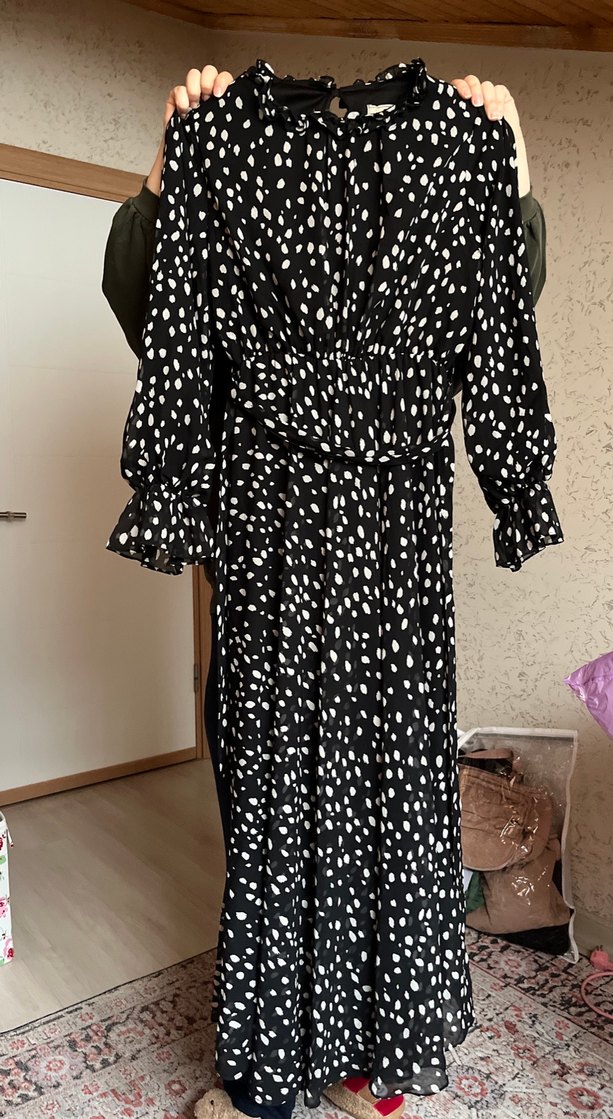 Siyah uzun elbise, bol kesim, uzun kollu ve V yaka detaylıdır. Kuşaklı beli lastikli ve puantiyeli deseniyle günlük kullanıma uygundur. İp çekmesi var o sebep uyguna vereceğim