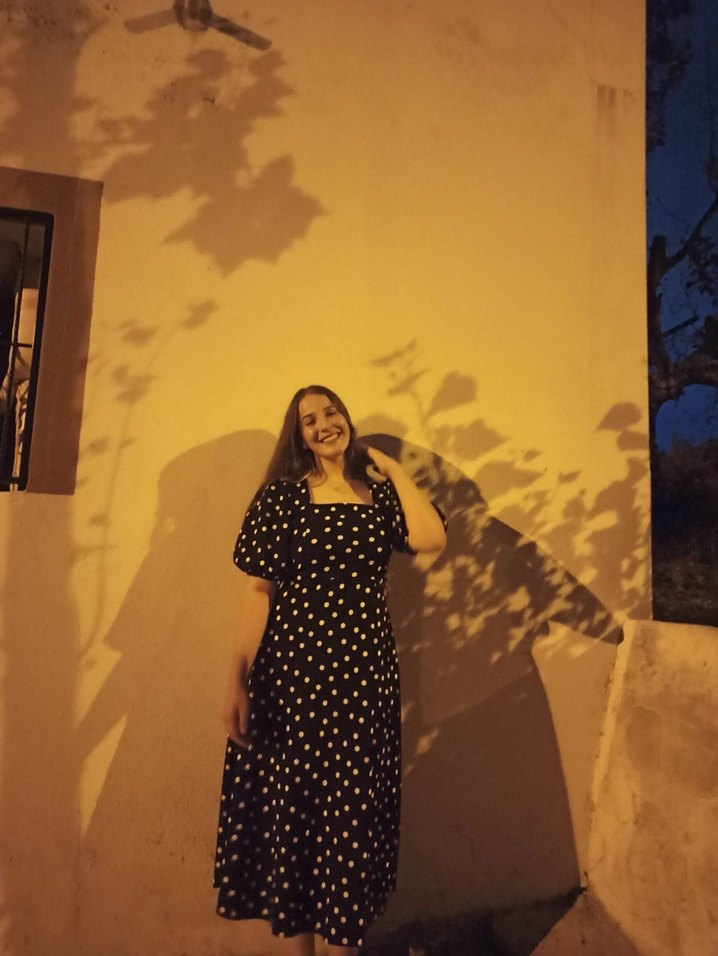 Siyah zemin üzerine beyaz puantiyeli, V yaka, drapeli midi uzunlukta ve bol kesim kısa kollu ipeksi kumaş elbise. Romantik akşamlar için uygun.