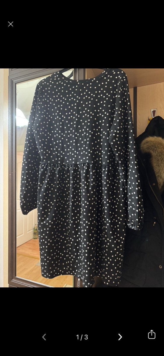 Siyah puantiyeli midi elbise, uzun kollu ve yuvarlak yakalıdır. Sentetik kumaştan, bol kesim ve pile detaylıdır, günlük kullanıma uygundur.