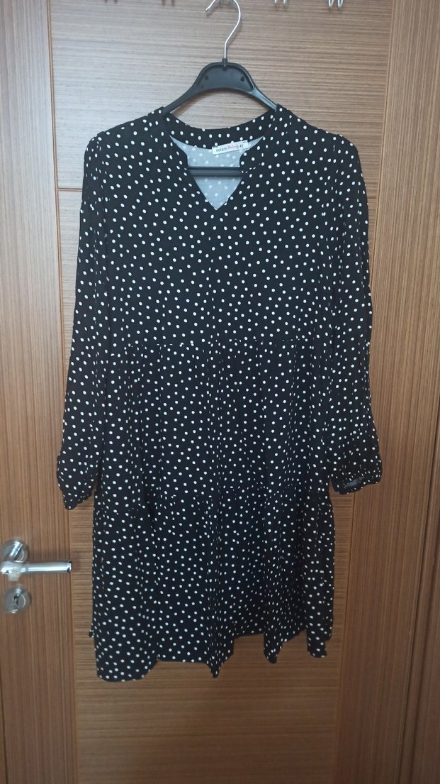 Siyah kumaş üzerine beyaz puantiyeli, düğmeli, V yakalı, uzun kollu, bol kesim midi elbise. Günlük rahat sokak stili için uygun.