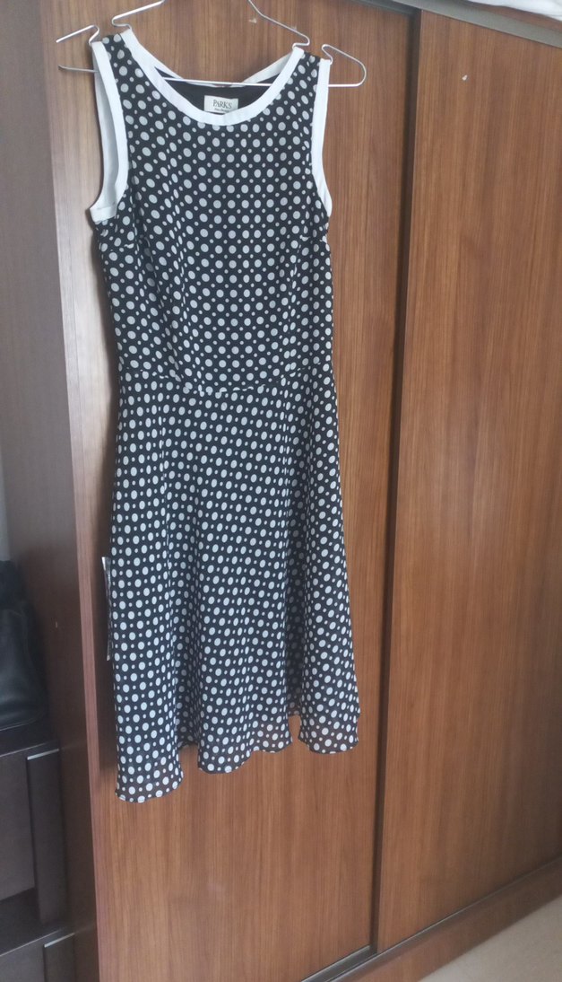 Bu siyah puantiyeli midi elbise, kolsuz ve V yakalıdır. Pilili detayları ve oturan kesimiyle günlük kullanıma ve özel günlere uygundur. boyurdan en aşağı 101 cm dir.