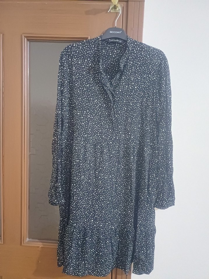 Siyah ve gri puantiyeli desenli, düğmeli, yakalı, uzun kollu, midi boyda bol kesim tunik. Günlük kullanıma uygun rahat bir model.
