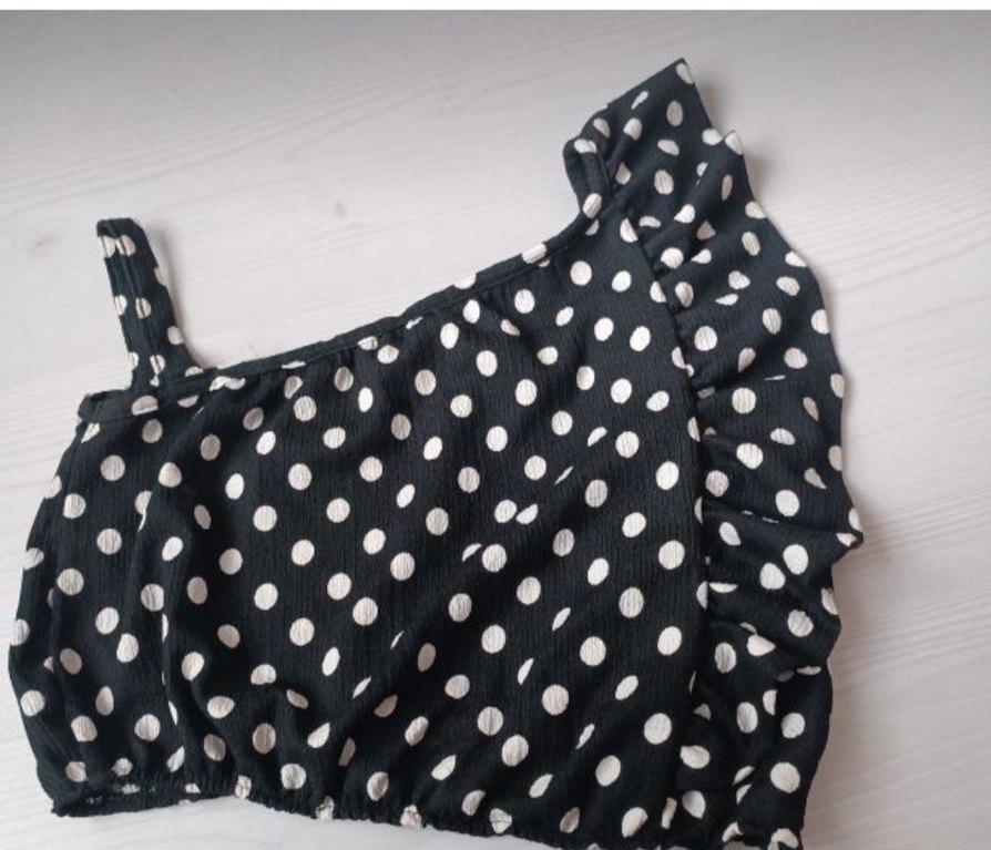 Siyah zemin üzerine beyaz puantiyeli, kısa kollu, balıkçı yaka ve fırfır detaylı, dar kesim mini hamile bluzu. Rahat sentetik kumaştan üretilmiştir.