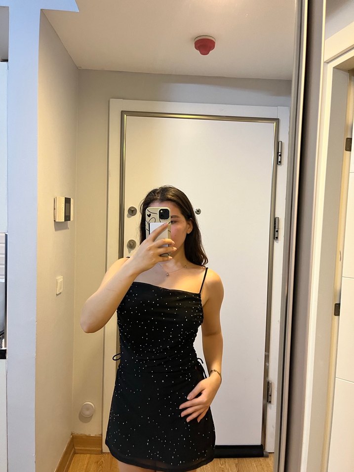 Siyah puantiyeli, straplez yakalı ve vücuda oturan mini elbise, romantik geceler için cesur ve göz alıcı bir tarz sunar.