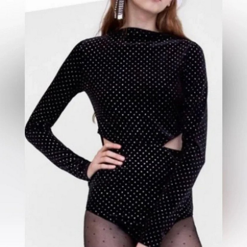 Siyah puantiyeli ve payetli, yüksek yakalı, uzun kollu, vücuda oturan bu bluz, sentetik kumaştan üretilmiştir. Cesur, gotik ve avangart tarzda parti için uygundur.