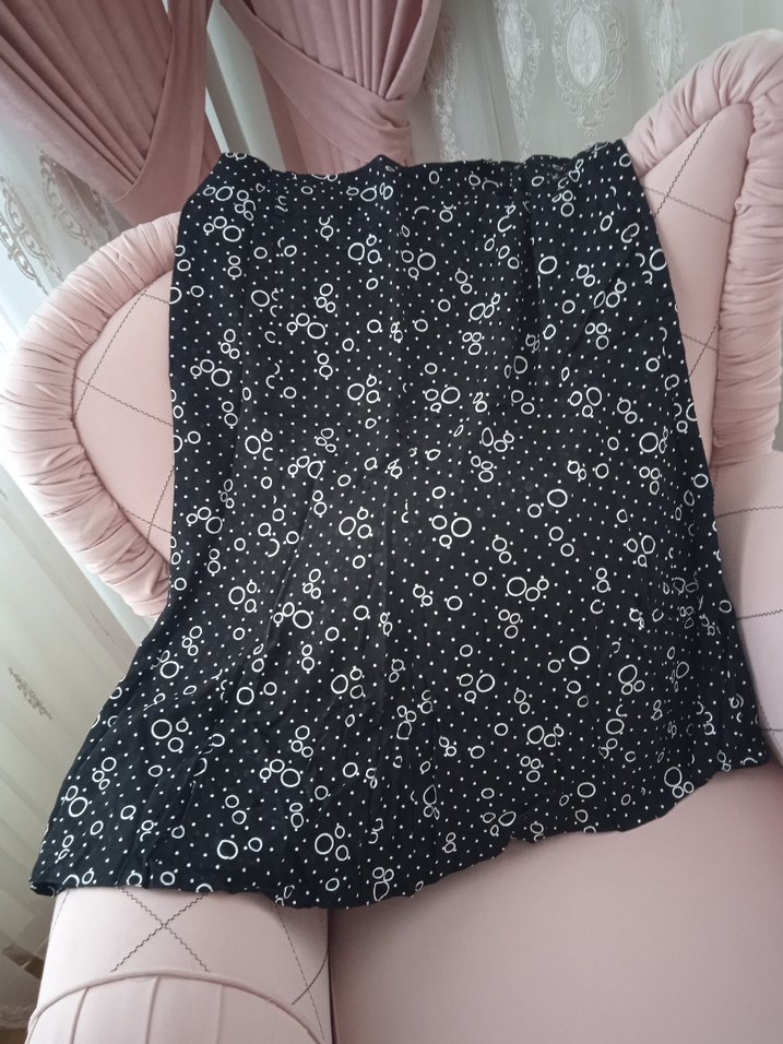 Bu siyah hamile eteği, piliseli ve puantiyeli desene sahip, rahat kesimdir. Yumuşak sentetik kumaştan yapılmıştır. Midi boyu günlük kullanım için uygundur.