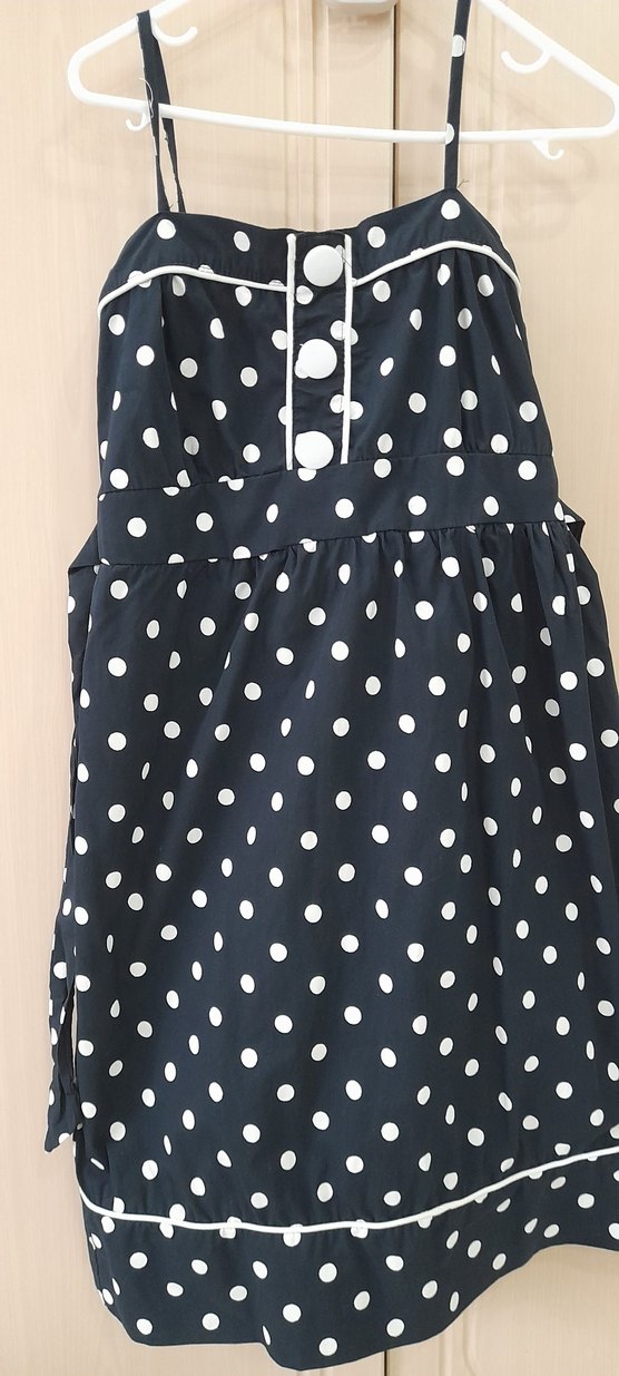 Siyah renkte, beyaz puantiyeli, düğmeli ve straplez yakalı pamuklu midi elbise. Vücuda oturan kesimiyle retro ve bohem tarzı yansıtıyor.