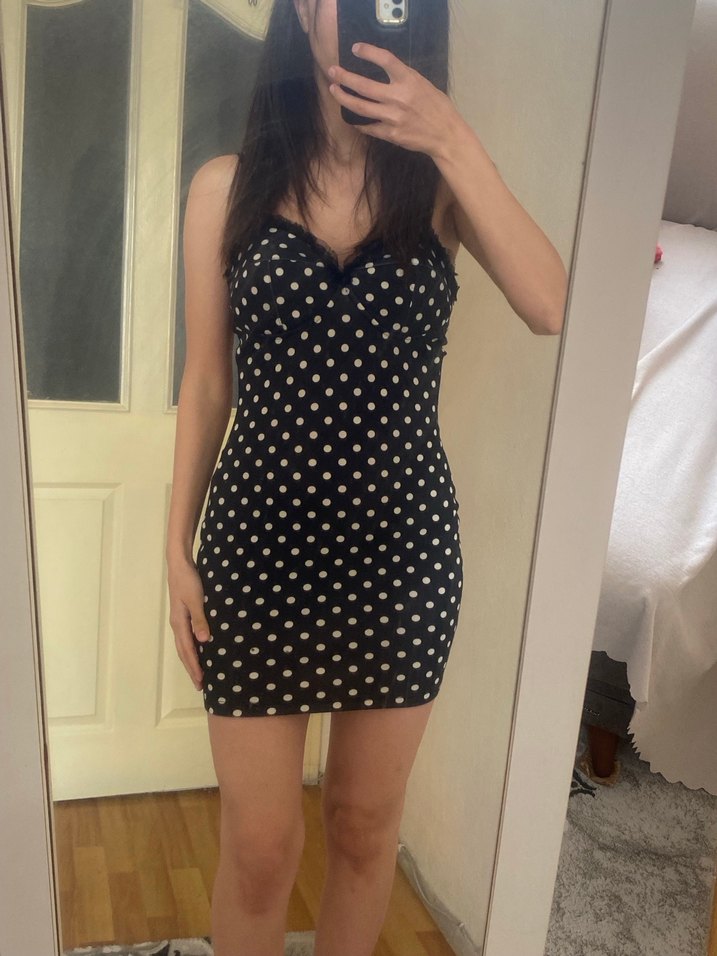 Siyah mini elbise, beyaz puantiyeli ve askılı kollu, sentetik kumaştan, cesur ve gotik tarzda. Romantik gece için zahmetsiz şıklık sunar. İki elbise için fiyatım (MARK TEMSİLİ)