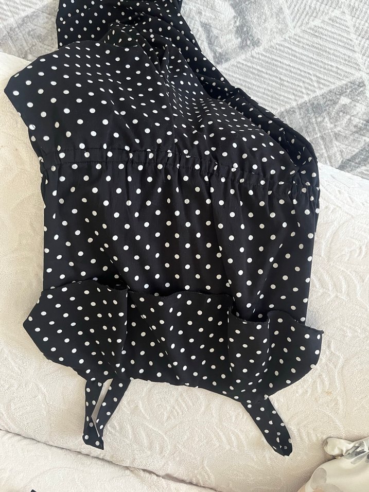 Canlı puantiyeli siyah bayan tulum çok rahat kesim ince askılı göğüs kısmı fırfır detaylı bol paça ile özel günlerin vazgeçilmez bir parçası sadece 3 defa kullanıldı hiç bir kusuru özürü yok
