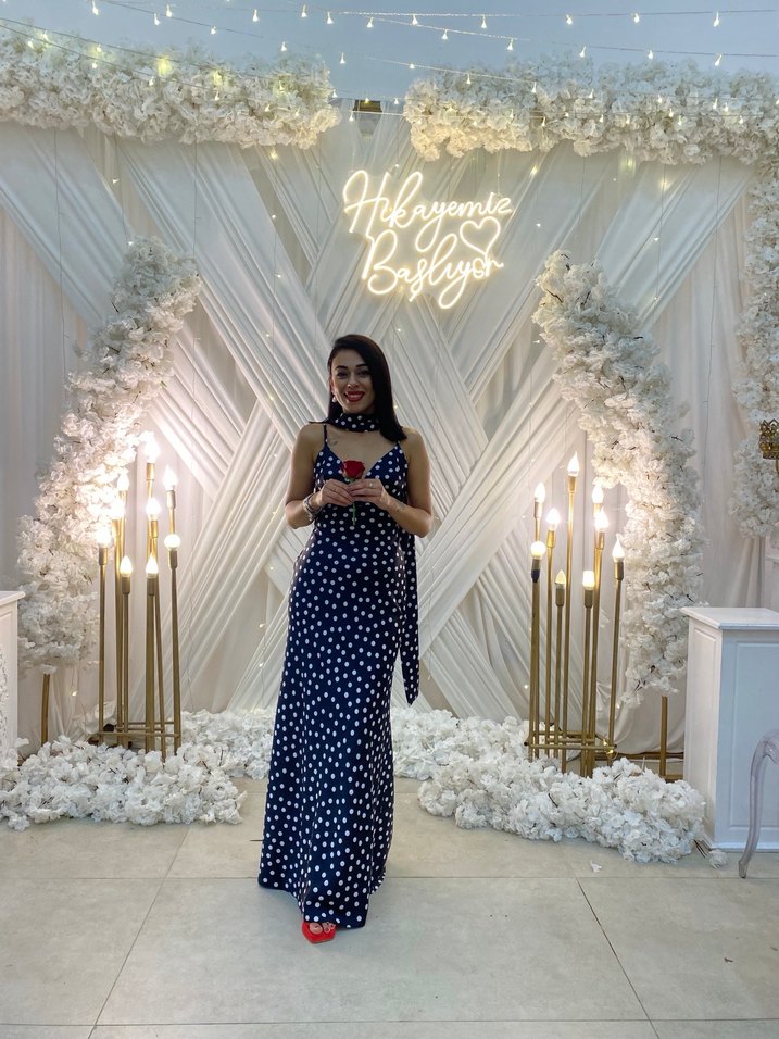 Siyah renkte, ipeksi dokulu, askılı ve V yaka uzun elbise. Drapeli tasarımı ve puantiyeli deseniyle bohem ve şık bir görünüm sunar. Düğünler için uygun.Bir kere giyildi dekolte kısmı çok az kapatıldı,ten kaçması var ama çok belli değil