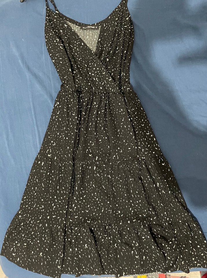 Siyah uzun elbise, V yakalı ve ince askılıdır. Beyaz puantiyelerle süslenmiş, pileli ve bol kesimdir. Bohem vintage tarzı, açık hava kullanımı için uygundur. Hiç giyinmedim çok güzel duruşu var S-M beden uyumlu olacaktır