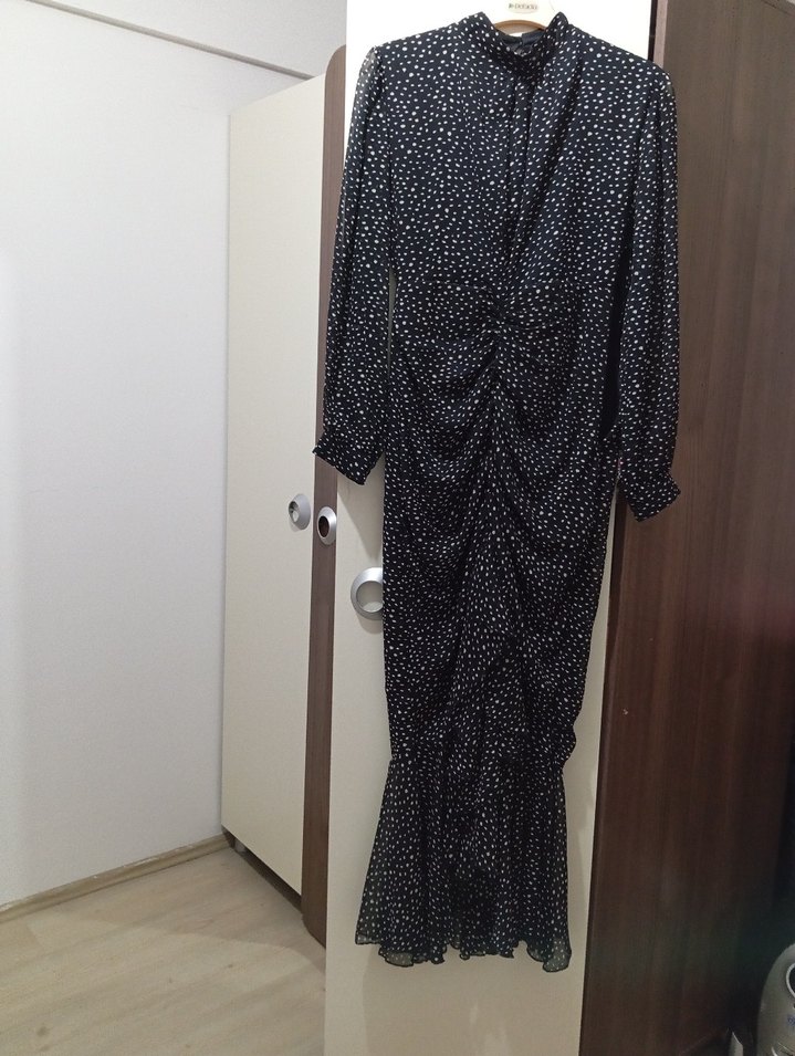 Siyah uzun elbise, drapeli ve vücuda oturan kesime sahiptir. Sentetik kumaştan, uzun kollu, puantiyeli ve yüksek yakalıdır. Günlük kullanım için uygundur. ✨