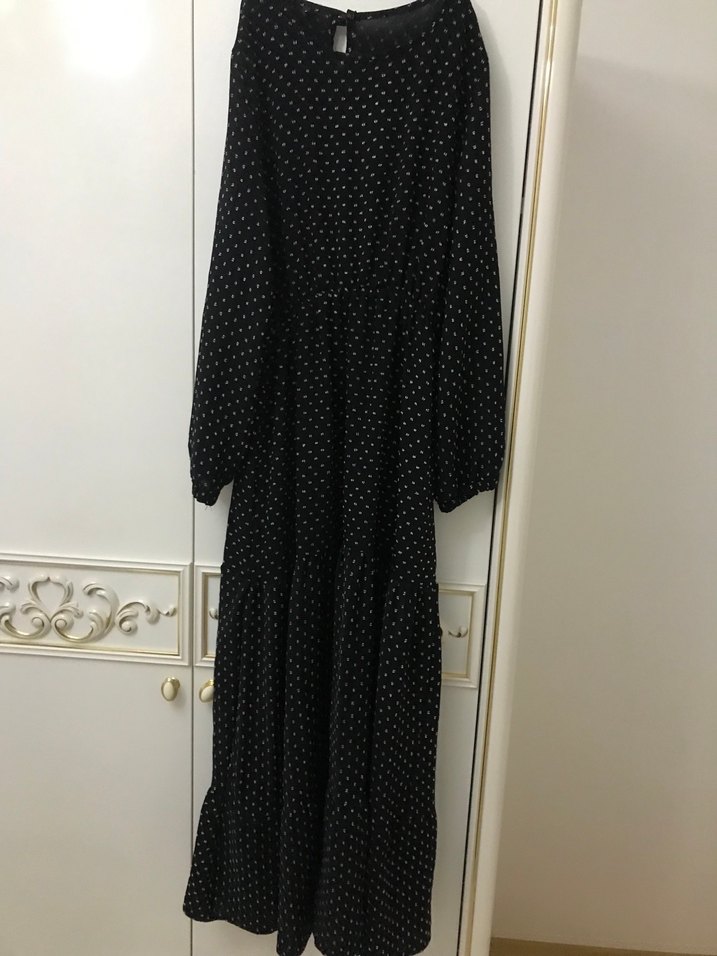 Siyah pamuklu uzun elbise, yüksek yakalı ve pile detaylıdır. Bol kesim, ince askılı ve minimalist puantiyeli desene sahiptir. Günlük kullanıma uygundur. Ikı koltuk arası 43
