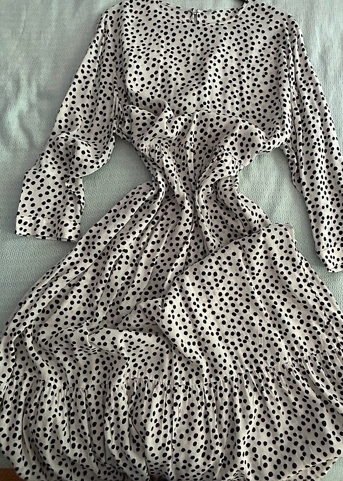 Beyaz üstüne siyah puantiyeli, etek ucu volanlı elbise, uzunluk omuzdan eteğe 135 cm. Hiç giyilmedi