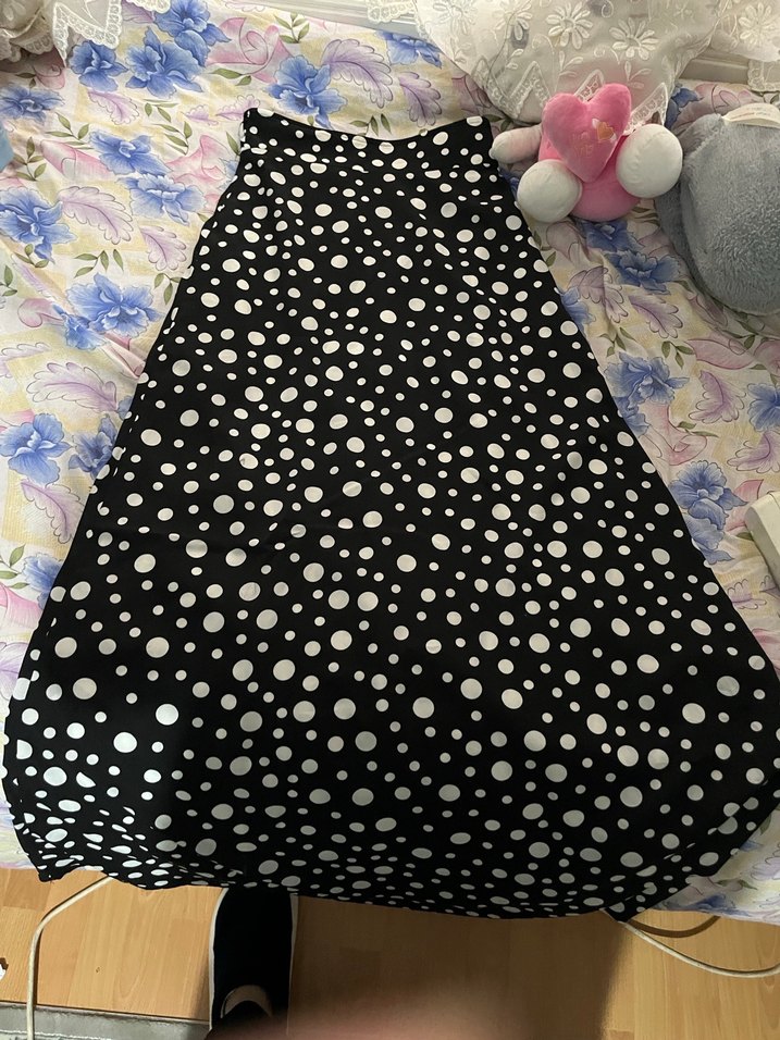 Siyah zemin üzerine beyaz puantiyeli, drapeli uzun etek . Rahat kesimi ve yumuşak sentetik kumaşıyla günlük kullanım için uygundur.