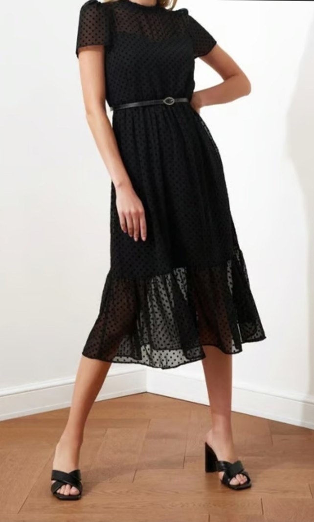 Siyah puantiyeli uzun elbise, kemerli ve askılı kolludur. Yuvarlak yaka ve sentetik kumaştan, günlük rahat kullanım için uygundur. Yeni alınmış etiketi üstündedir.