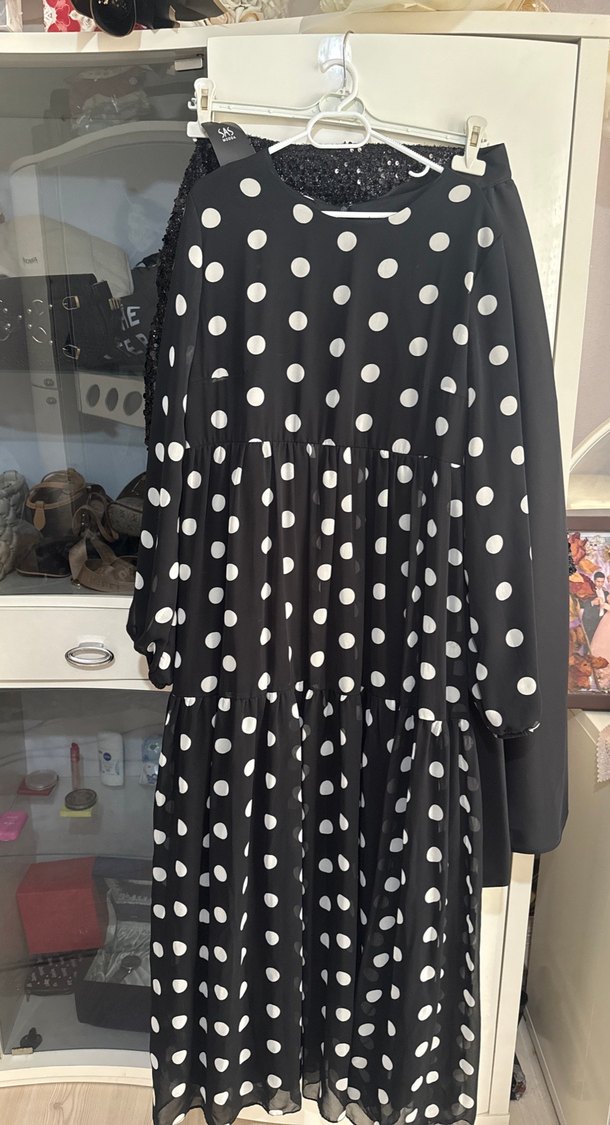 Siyah zemin üzerine beyaz puantiyelerle desenlenmiş, bol kesim ve fırfır detaylı uzun elbise. Yumuşak sentetik kumaştan, uzun kollu ve yuvarlak yakalıdır.