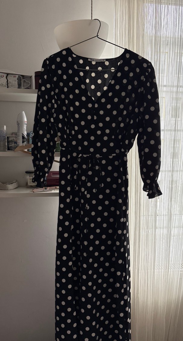 Uzun, bol kesim kadın elbise; siyah zemin üzerine beyaz puantiyeler ve uzun kolludur, bohem Paris tarzını yansıtır.