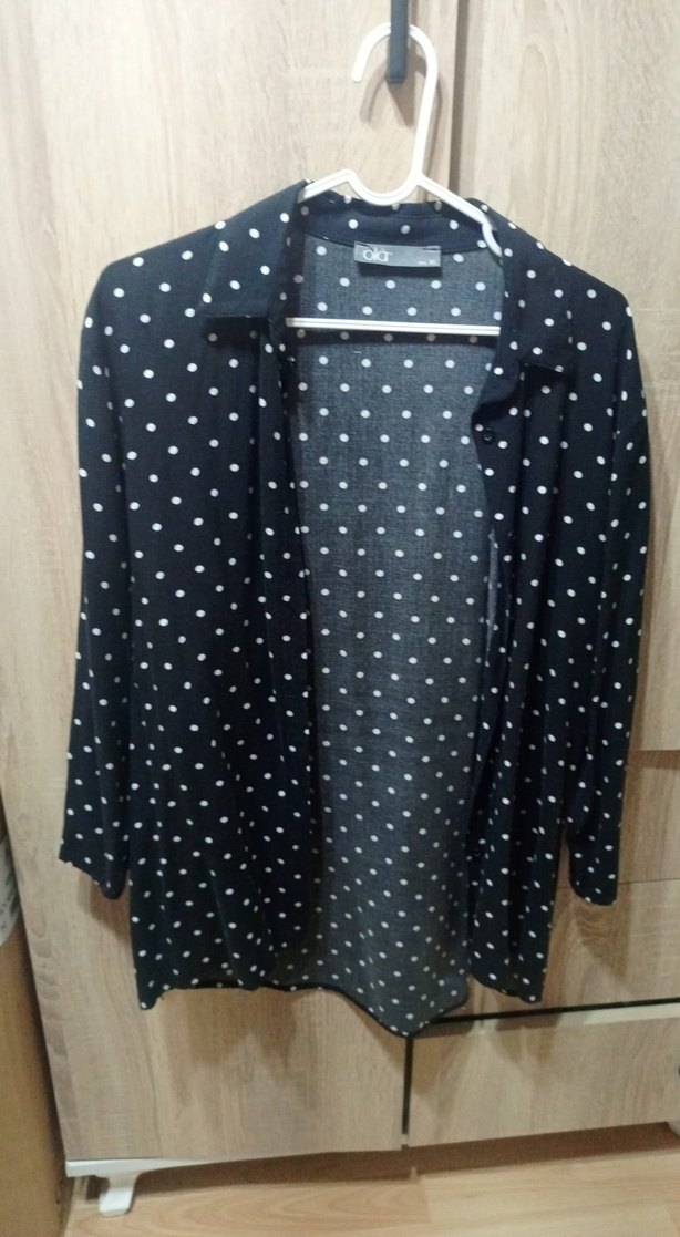 Siyah, beyaz puantiyeli, uzun kollu, düğmeli ve kesik yaka detaylı bol kesim gömlek. Sentetik kumaştan, günlük kullanıma uygun. M beden