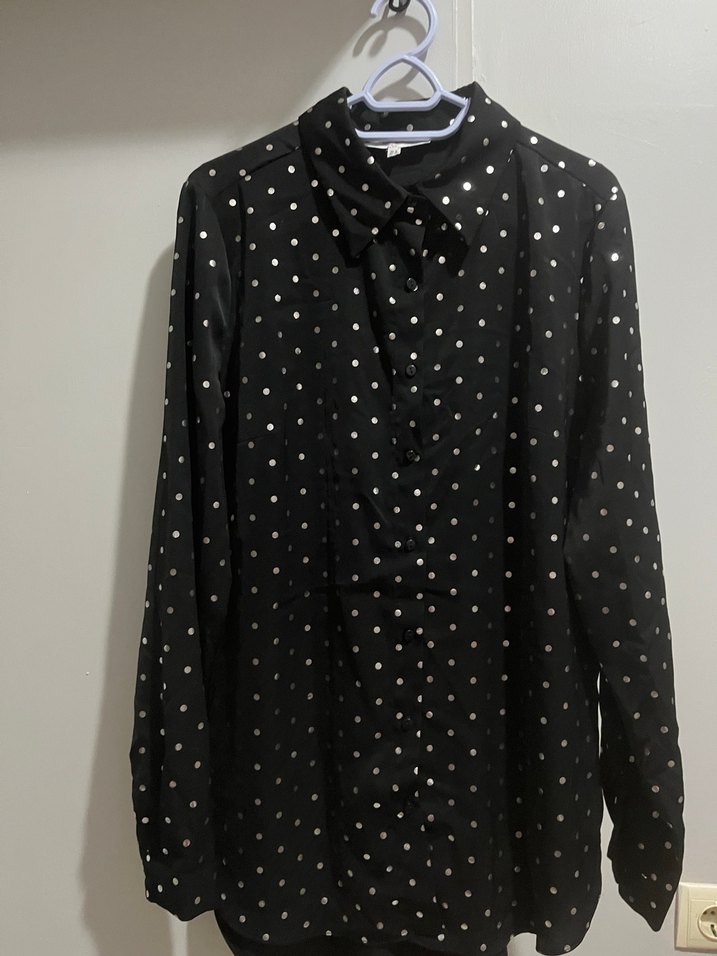 Siyah puantiyeli, düğmeli ve yakalı uzun kollu gömlek. Gevşek kesim ve midi boyda, sentetik kumaştan üretilmiştir.