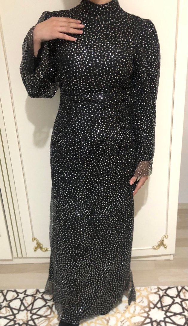 Siyah, uzun kollu, yüksek yakalı ve puantiyeli payet detaylı bu dar kesim gece elbisesi romantik akşamlar için uygun. ✨ 1 kere giyindim