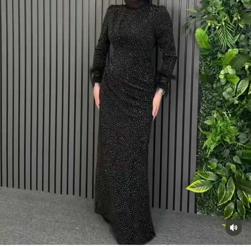 Siyah, puantiyeli ve uzun kollu, yüksek yakalı bu dar kesim uzun elbise, drapeli detaylarla ofis ortamına uygun mütevazı ve göz alıcı gotik tarz sunar.