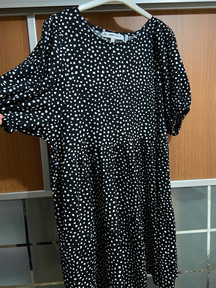 Siyah zemin üzerine beyaz puantiyeli, kısa kollu, yuvarlak yakalı, salaş kesim uzun elbise. Etek kısmında volan detayları bulunur, hafif sentetik kumaştan üretilmiştir.