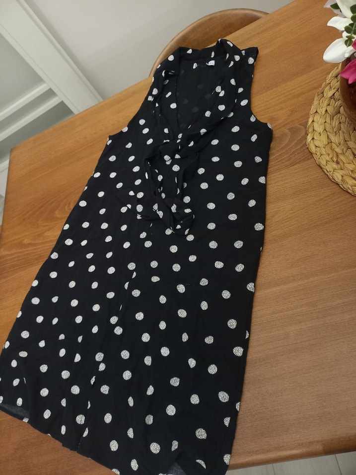 Siyah zemin üzerine beyaz puantiyeli, düğmeli, V yakalı ve kolsuz uzun elbise. Rahat sentetik kumaştan, günlük şehir stili için uygun.