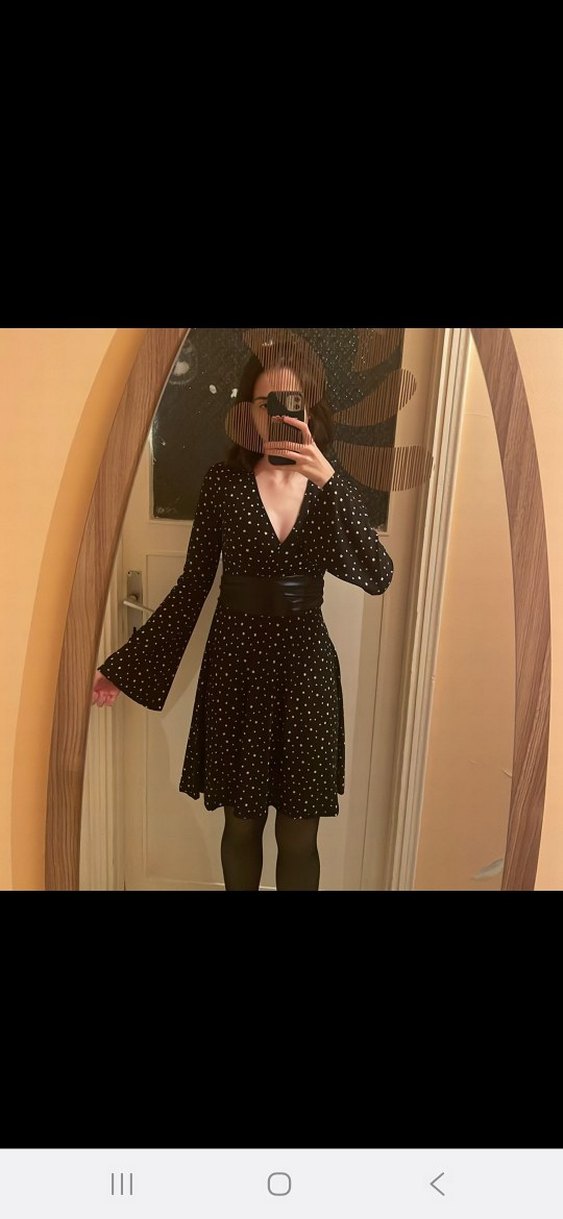 Siyah puantiyeli, V yaka, uzun kollu, deri kemerli, midi boy dar kesim elbise. Romantik akşamlar ya da doğum günleri için de günlük kullanım için de uygundur, kemeri çıkarılabilir.