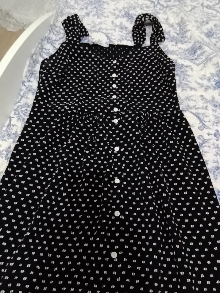 Siyah puantiyeli, düğmeli uzun elbise, kolsuz ve V yakalıdır. Bol kesimiyle bohem sokak tarzına uygundur.